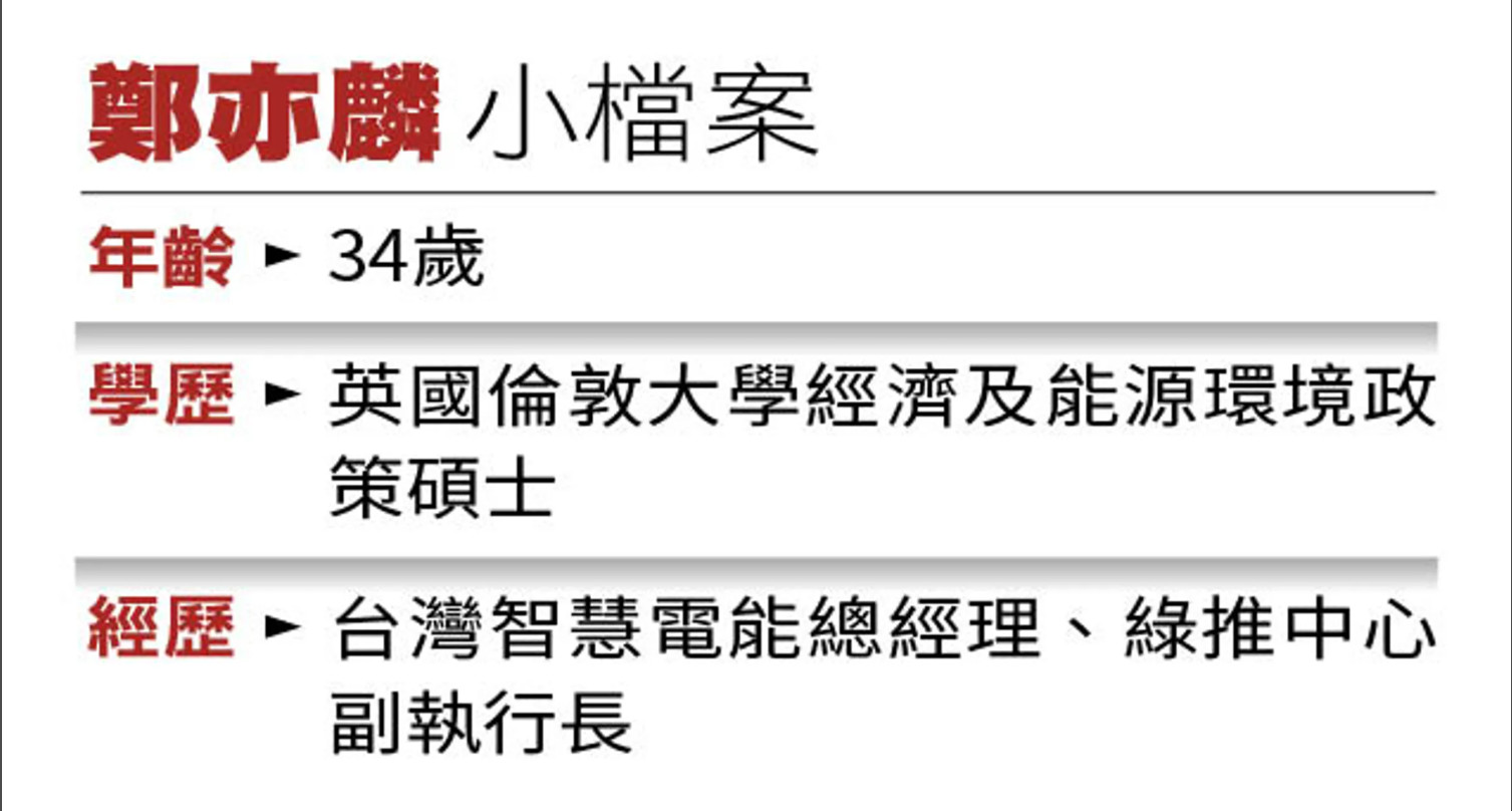 一名風電業者告訴本刊,饋線容量攸關電網配電系統中可供再生能源,例如太陽能光電或風電的發電設備連接併網的可用容量額度,若容量有限,光電業者就需申請或排隊才能取得,否則無法將所發電力併聯輸送到主電網供電運作。因此,饋線容量成為供電稀有資源,有本事的廠商甚至可透過管道取得更高的額度,一旦有人上下其手,透過關說或行賄即爆發弊案。 本刊調查,鄭亦麟現年34歲,他從台大經濟系畢業,即赴英國倫敦大學取得經濟及能源環境政策碩士學位,拿到碩士返台後,在民進黨「台灣世代智庫」擔任研究員,後來擔任能源政策操盤手之一,以筆名「Luke」與「核能流言終結者」黃士修筆戰而成名。 鄭亦麟在27歲即任綠能推動辦公室副執行長,由於參與數兆元的光電產業與離岸風力政策推動,加上他與沈榮津互動頻繁,成為不少再生能源業者亟欲攏絡的對象,前途一片看好,卻把持不住自己,恐遭司法重判。