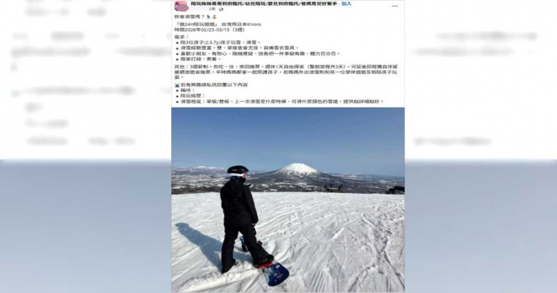 ▼女子原先發布於臉書社團「背包客自助滑雪討論區」疑似已遭刪除,《CTWANT》實際查詢網路後,發現對方在另一個臉書社團貼出同樣的徵人啟事。(圖/翻攝自「陪玩姊姊哥哥到府臨托/幼兒陪玩/嬰兒到府臨托/爸媽育兒好幫手」臉書)