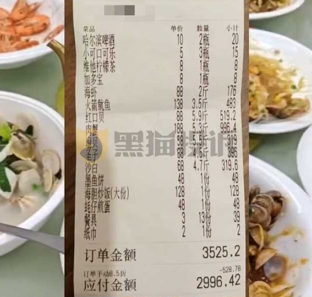 這名人妻向《黑貓投訴》爆料,一家人在廣東一家海鮮餐廳消費了3000多人民幣(約1.3萬新台幣),其中包括2個嬰兒,還有3個身高不足110公分的兒童,竟然全都被按成人標準收取費用。