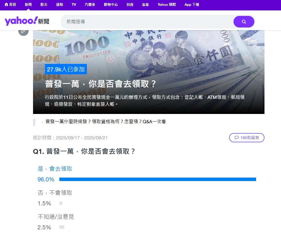 「Yahoo奇摩」從17日發起網路投票,並以「普發一萬,你是否會去領取?」當命題,投票將持續到21日,檢視發現截至18日中午12點,在參與投票的2.7萬人當中,表態「會去領取」的比例高達96%,主張「不會領取」的僅1.5%,至於「不知道/沒意見」的則有2.5%。