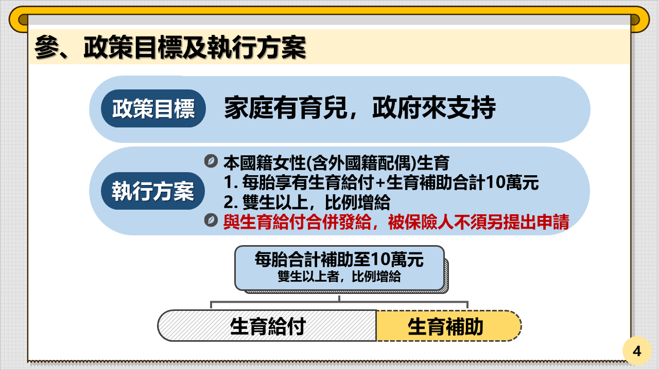 勞動部表示,各類社會保險女性被保險人(含與本國國民結婚之外國籍配偶)生育,除可請領原有的社會保險生育給付外,將由政府另外編列公務預算加給生育補助,合計每胎10萬元,且雙生以上者,依比例增給。被保險人不須另外提出申請,達到簡政便民的效益。