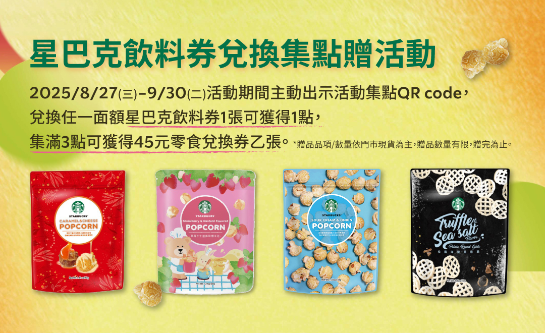 活動期間主動出示活動集點QR Code,兌換任一面額星巴克飲料券1張可獲得1點,集滿3點可獲得45元零食兌換券乙張。