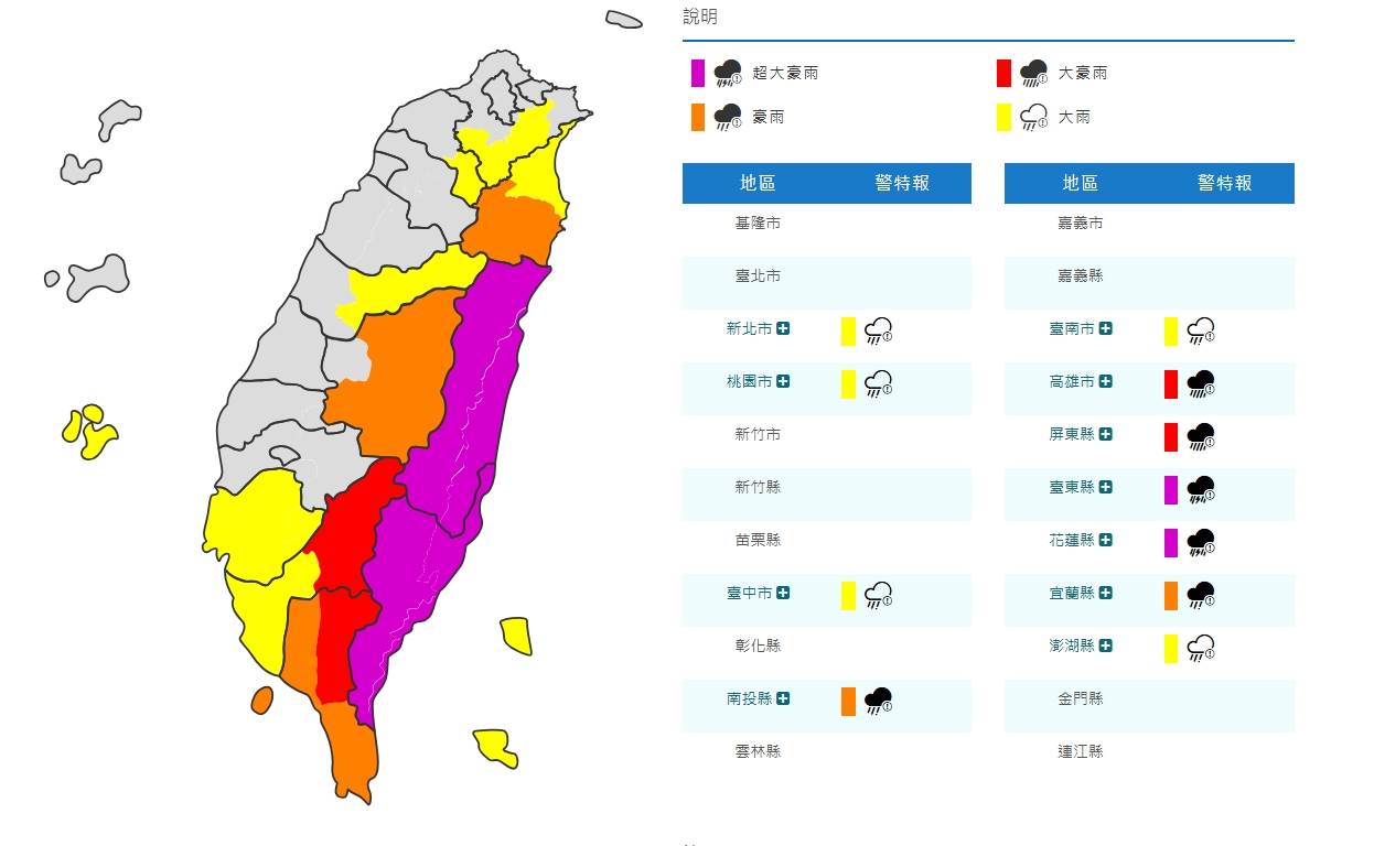 受樺加沙外圍環流影響,中央氣象署對全台11縣市發布超大豪雨、大豪雨、豪雨、大雨特報,其中2縣雨量達到紫爆等級。