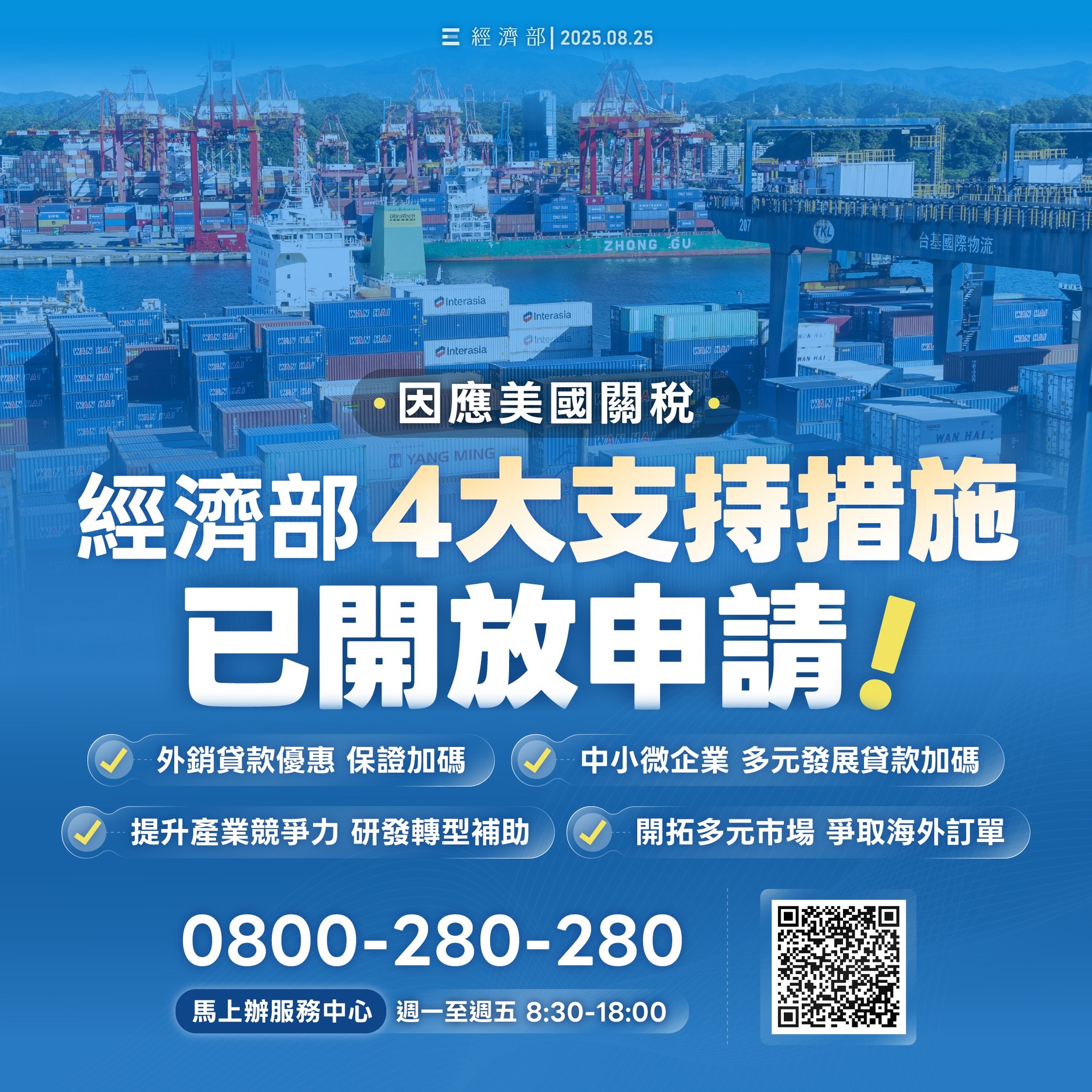 為確保國內廠商能充分了解並運用相關產業支持措施與補助資源,除了必要的媒體宣傳外,政府更規劃了多元化的資訊傳達與服務管道,包含設立免付費諮詢專線0800-280-280、行政院設置臺美關稅談判及產業支持方案網站,供業者查詢對等關稅說明、產業影響評估及產業支持方案等資訊。未來經濟部將持續與各產業公協會合作推廣說明,並協助有需求業者提出申請。