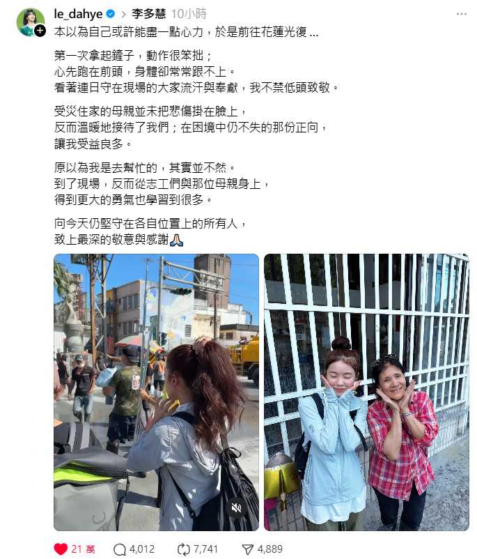 李多慧看到Threads網友拍的照片,也笑回覆:「你怎麼認出那張臉的啊……?哈哈,我們一起加油吧!」事後她親自感性發文表示,本以為自己或許能盡一點心力而前往花蓮光復,第一次拿起鏟子,動作很笨拙;心先跑在前頭,身體卻常常跟不上,「看著連日守在現場的大家流汗與奉獻,不禁低頭致敬,向今天仍堅守在各自位置上的所有人,致上最深的敬意與感謝。」