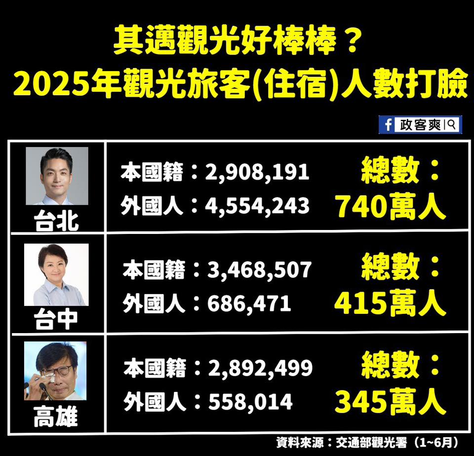 「政客爽」還加碼分享今年觀光住宿數據,今年1~6月台北市總數為740萬人,其中本國籍290萬8191人次、外國籍455萬4243人次;台中總數415萬人,其中本國籍346萬8507人次、外國籍68萬6471人次;高雄總數345萬人,本國籍289萬2499人次、外國籍55萬8014人次。