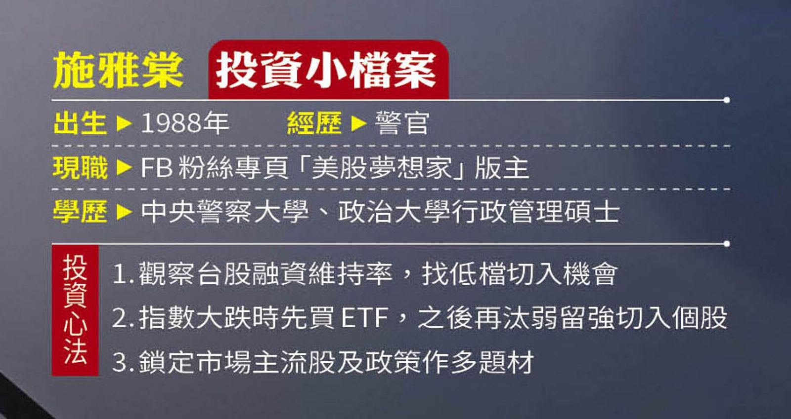 6年前,美股投資達人施雅棠從警官退休時僅30歲,靠著年領百萬被動收入,提早過自己想要的生活。這幾年,他因勇敢追高,逮住多檔飆股,財富再翻倍。事實上,施雅棠追高背後憑藉的是極強的資金管理能力,及對個股扎實的研究,如此才能進退有據,持股抱好抱滿。