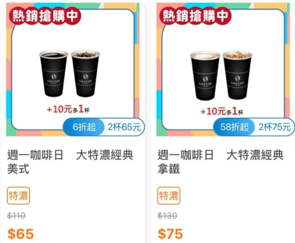 大件特濃拿鐵2件75元,等於一件38元(5.8折)