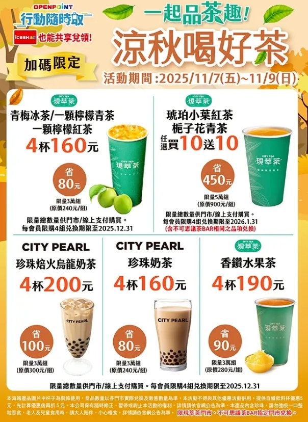 青梅冰茶/一顆檸檬青茶/一顆檸檬紅茶4件160元,等於一件40元(6.7折)