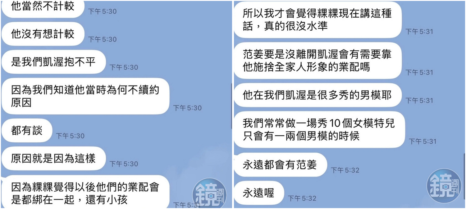 粿粿講出她這邊的敘事,網上立刻有「軟飯男」「媽寶男」的標籤貼在范姜彥豐身上,但范姜彥豐的前公司內部人士向本刊表示,在婚前其實范姜彥豐是凱渥的首席男模,一線精品工作一直非常穩定。