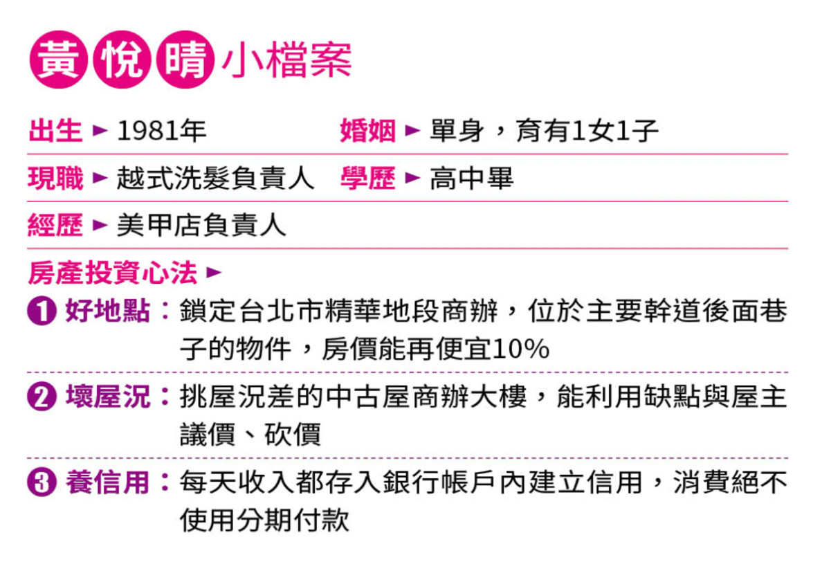 30歲那年,黃悅晴結束婚姻,帶著一雙兒女留在台灣,從美甲店起步。33歲時她立下志願,40歲要在台灣買房,且一定要台北市,如今已達標,台灣、越南兩地月收入租金超過15萬元。即使現在靠租金收入就能過活,卻仍每天工作10小時以上,積極參與社交活動拓展人脈,「我喜歡工作,也習慣節儉。」