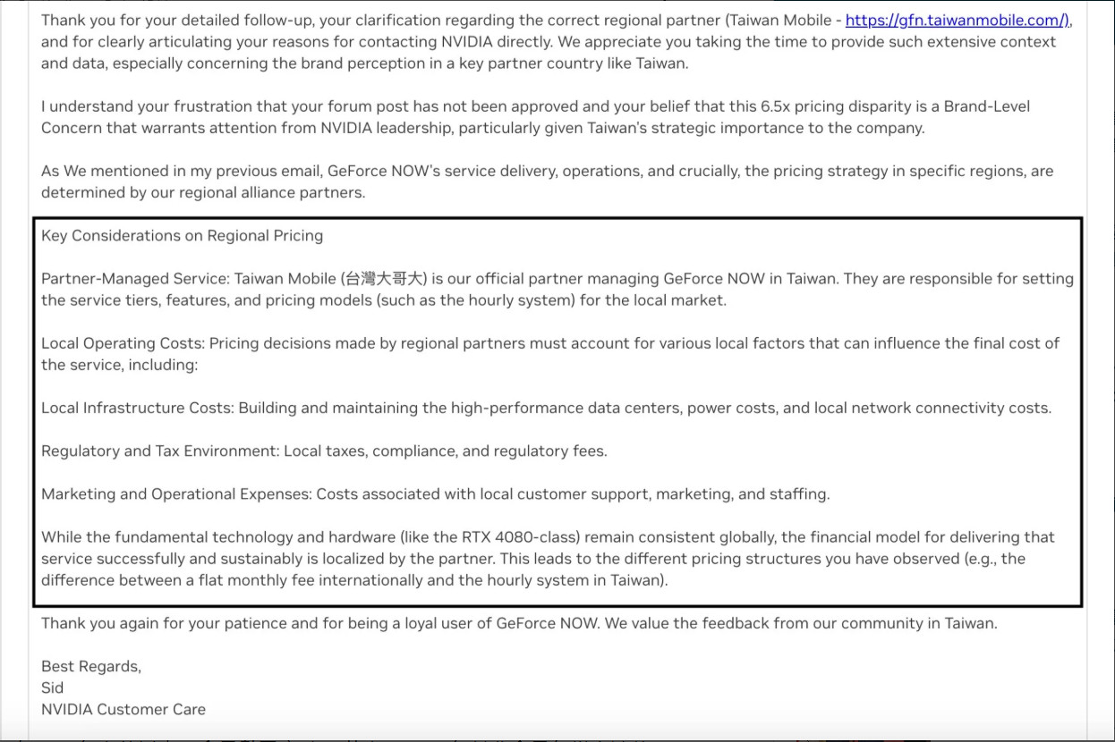 ▼輝達客服回覆消費者關於台灣GeForce NOW定價的可能因素。(圖/讀者提供)