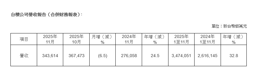 (2025/12/10 09:13)台積電11月營收3436億 月減6.5%、年增24.5%