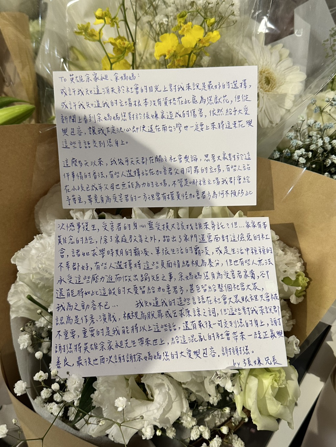 有網友在Threads上發文並附上一張照片顯示,一束花束上附上2張卡片,卡片上的內容署名「張嫌兄長」,內容中除了致意英勇擋刀身亡的余家昶與他的家人之外,也提到家家有本難念的經等內容,並在卡片最後再次致意余媽媽的大愛與包容。