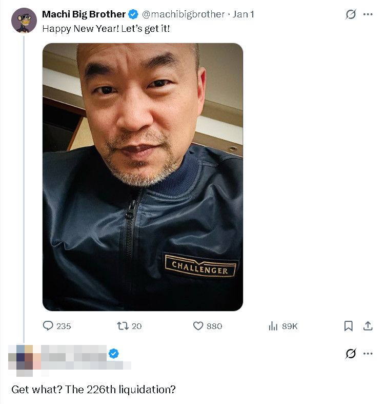 根據區塊鏈公開數據,黃立成自去年10月起頻繁進行高槓桿交易,清算次數累計已突破200次,損失逾7.2億台幣,甚至引來國外網友調侃「Get what?The 226th liquidation?(Get什麼?第226次清算嗎?)」。