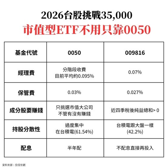 經理費:009816 為 0.07%,較優。0050 採取分階段收費,目前平均約 0.095%。