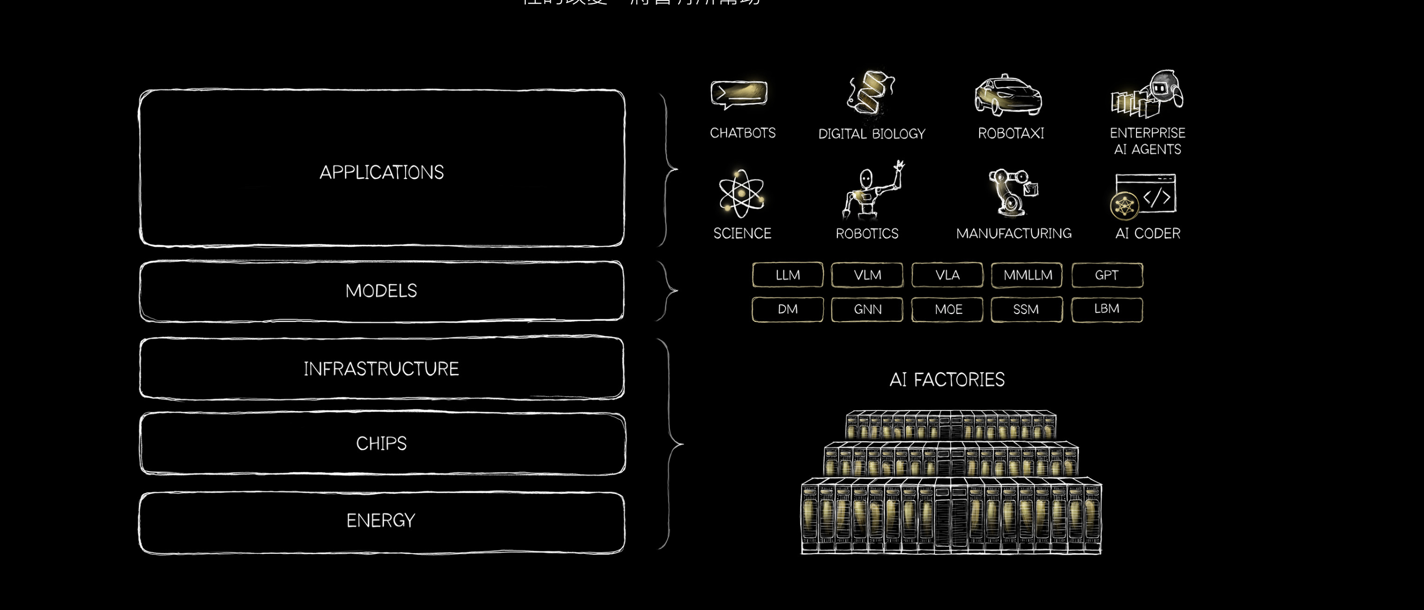 黃仁勳將這場產業轉型解析為一個五層堆疊的「蛋糕」架構。最底層是能源,他認為這是 AI 的第一性原理,因為每一顆詞元的產生都是能源轉換的結果。第二層是晶片,負責高效能平行運算。第三層則是基礎設施,包含散熱、網路與電力輸送,這些系統被稱為「AI 工廠」。第四層是模型,涵蓋語言、生物、化學等各領域的推理能力。最上層則是產生經濟價值的應用,如藥物研發或自動駕駛。他強調:「每一個成功的應用程式,都依賴其下方的每一層架構,一直向下延伸至發電廠。」