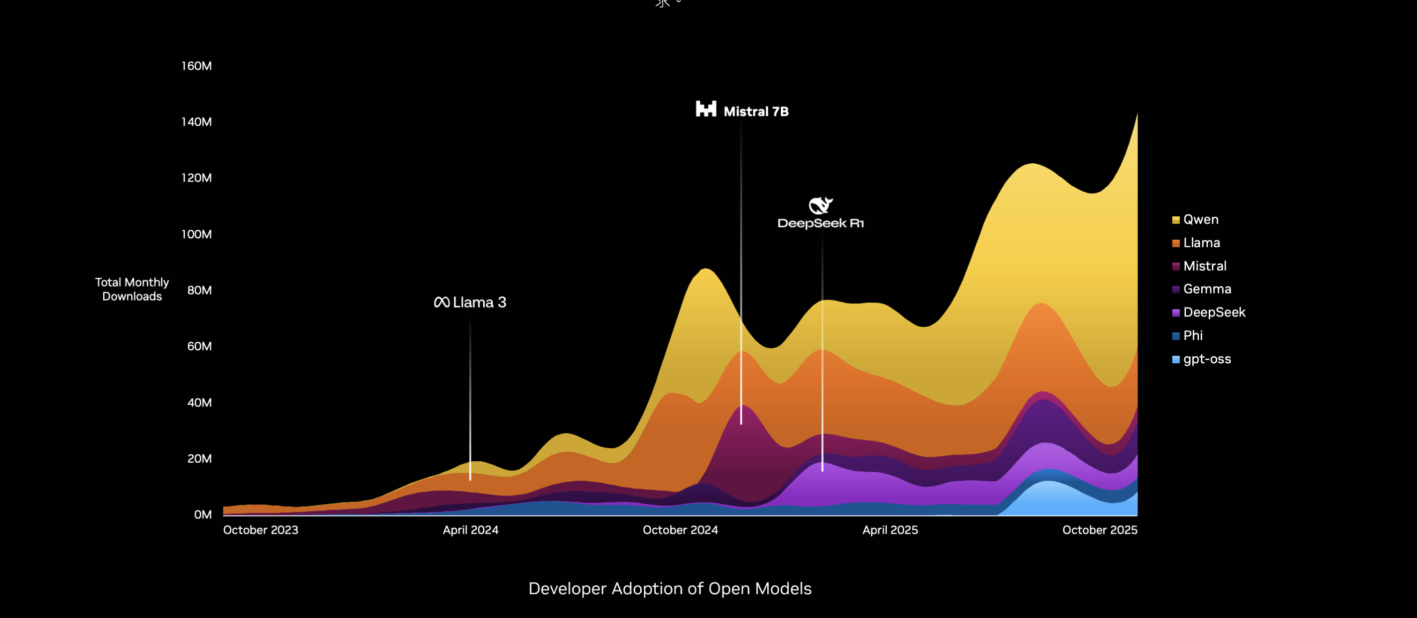 ▼開源模型在其中扮演關鍵角色。它加速了應用層的採用,提升了對訓練算力、基礎設施、晶片與能源等底層資源的需求。(翻攝自輝達官網)