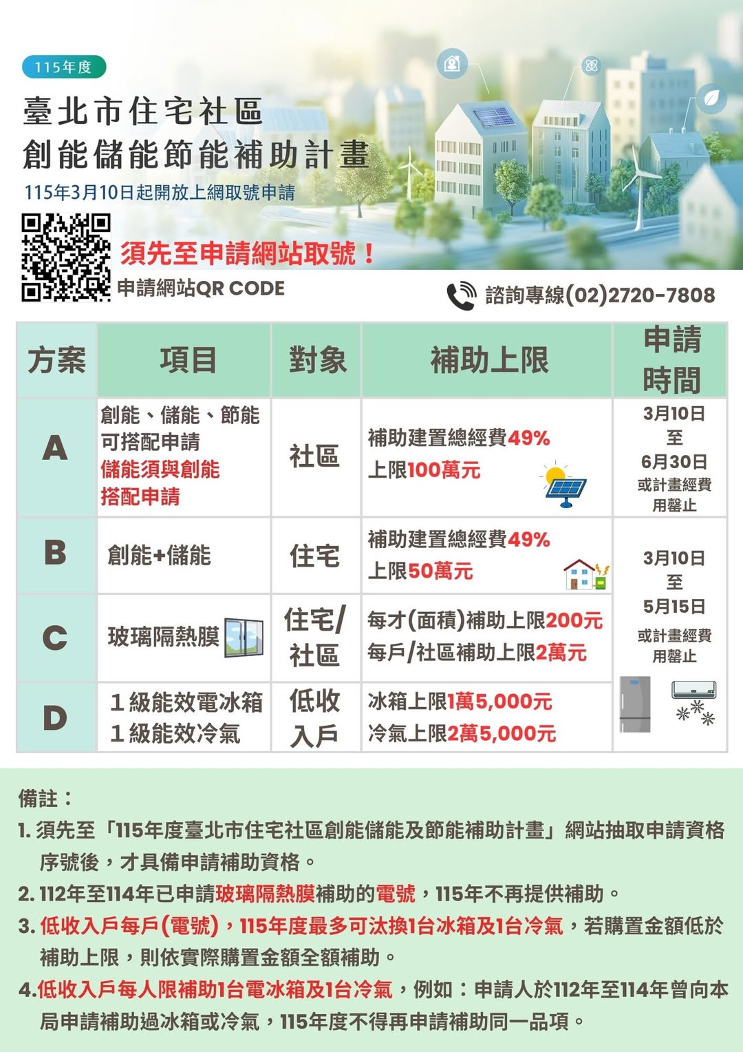 *方案A、B、C、D均須先至「115年度臺北市住宅社區創能儲能及節能補助計畫」網站抽取申請資格序號後,再送件至本局申請補助。