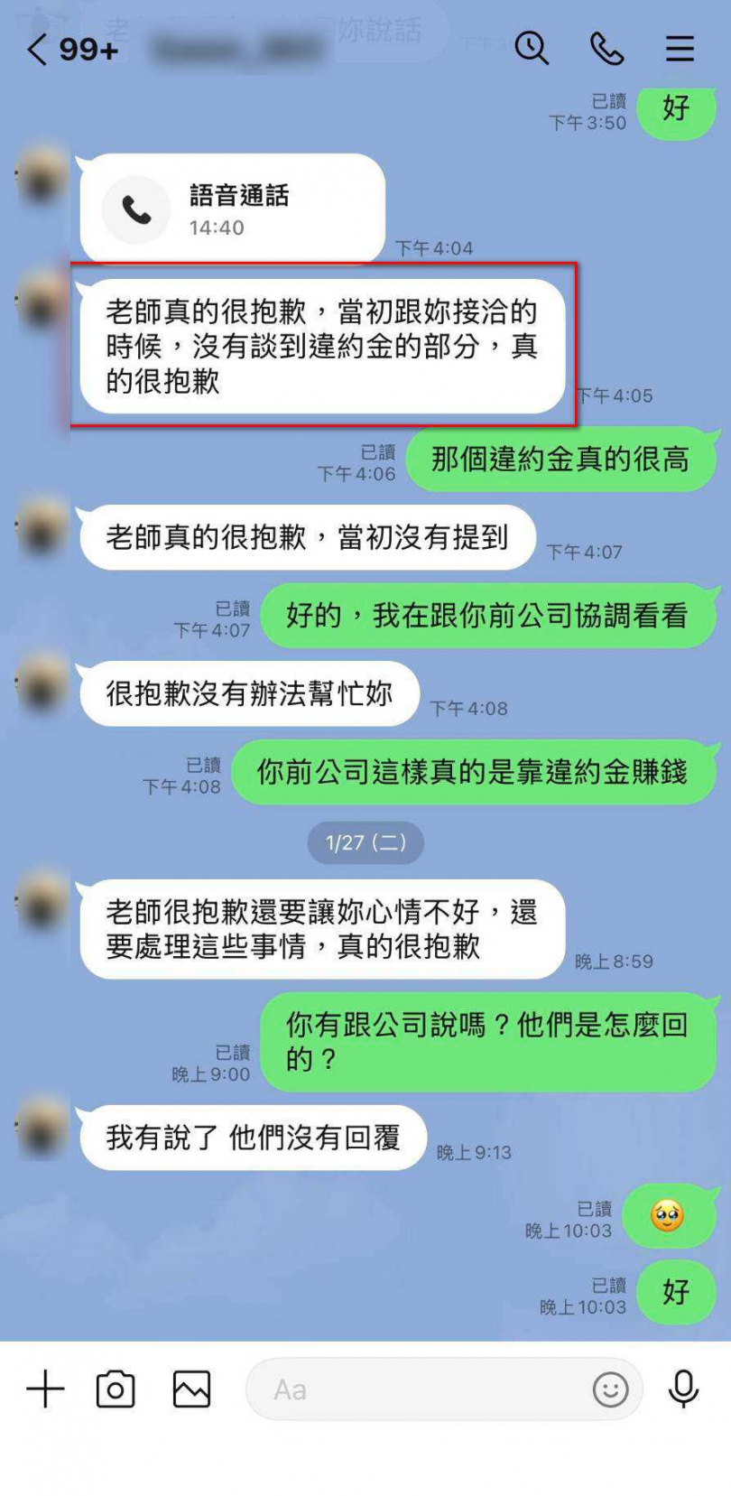 ▼業務員傳訊息,坦承當初推銷該方案時,沒有提到有違約金一事。(圖/讀者提供)