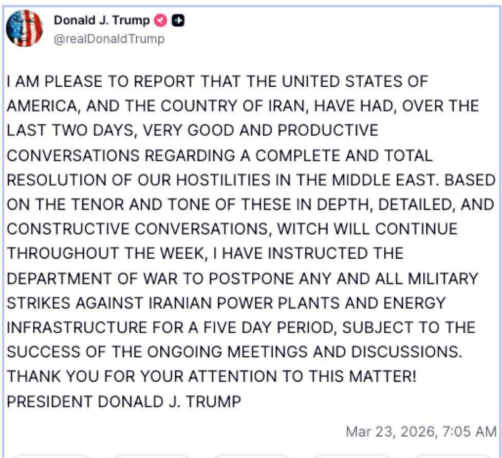 ▼川普宣稱美國與伊朗就「全面解決中東敵對狀態」進行了「良好且富有成效的對話」,並暗示未來5天內可能達成協議。(圖/翻攝《Donald J. Trump》的Truth Social)