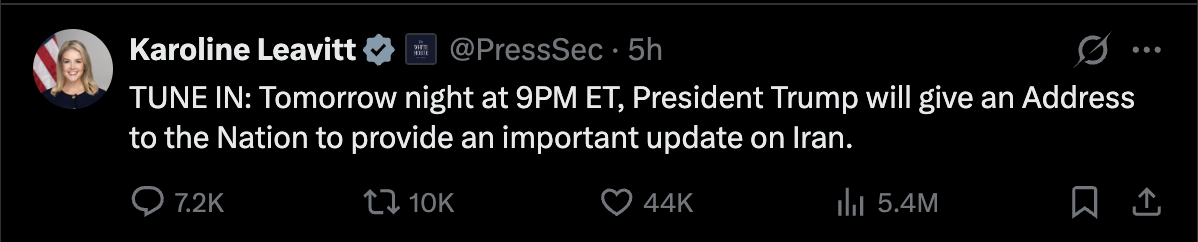 白宮發言人李維特(Karoline Leavitt)在社交平台X上證實,川普總統將於當地時間週三晚間9點,從白宮向全國發表重要談話。李維特在貼文中寫道:「請準時收看:明晚東部時間9點,川普總統將發表全國演說,針對伊朗問題提供重要更新。」這場演說被視為川普政府對當前中東衝突的最新立場宣示,也引發了外界對於地緣政治下一步走向的高度關注。