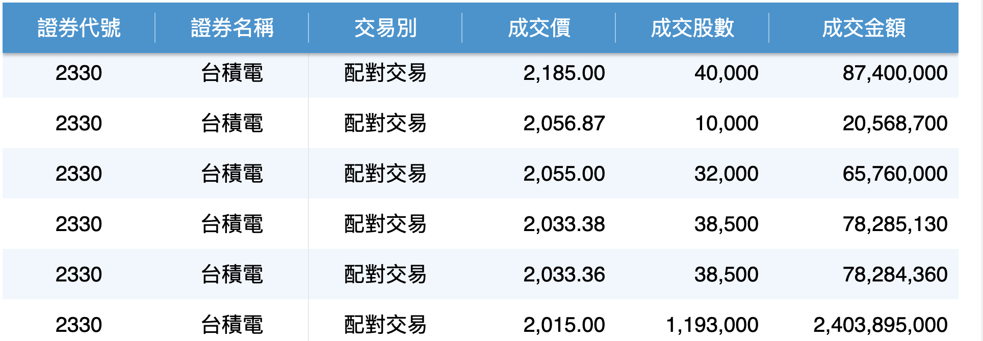 根據證交所統計,台積電14日的鉅額配對交易共有六筆,成交價格上下緣介於2,185元至2,015元之間。當日總成交張數達到1,352張,總成交金額約27.34億元,平均價格則落在2,022元。這些數據顯示,儘管現貨已創天價,法人與大額投資人對於後市的溢價認同度依舊極高。