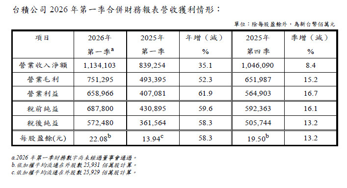 ▼台積公司2026 年第一季合併財務報表營收獲利情形。(圖/台積電提供)