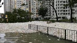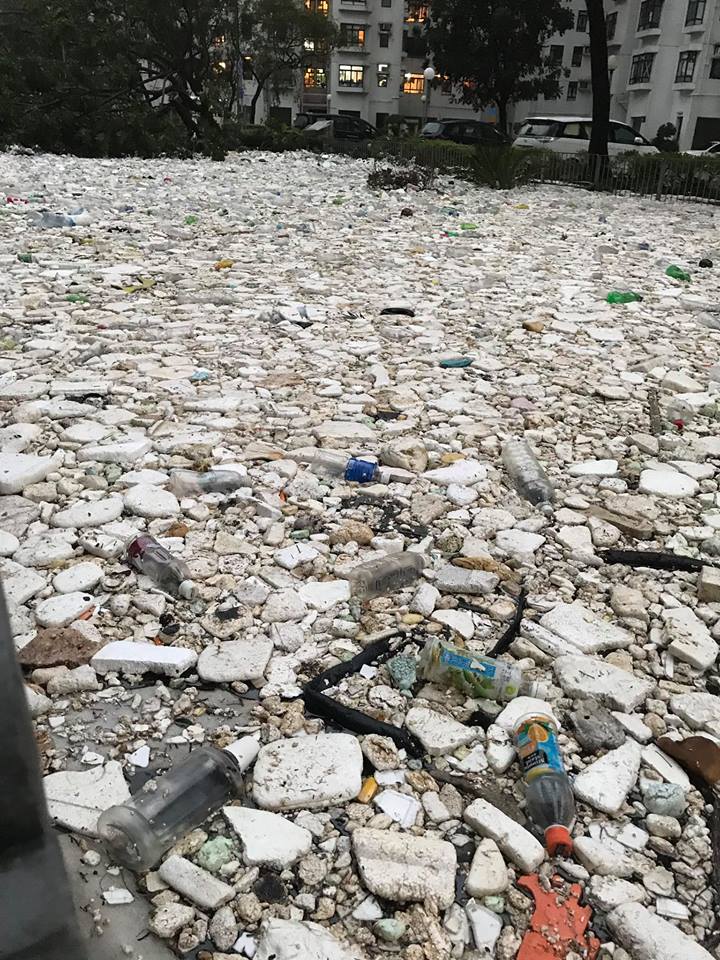 許多香港網友在臉書社團「香港突發事故報料區」分享,杏花邨受到「山竹」颱風肆虐的慘況,從照片中可見,不論是手扶梯、街道或是廣場,放眼望去幾乎都是一片慘白。然而,仔細一瞧才發現,這些東西居然是從海洋被「反沖」回陸地的垃圾,大多都是塑膠寶特瓶、保麗龍盒等難以分解的製品;而部分路段的積水就算尚未完全退去,水面上也漂浮著被吹斷的樹枝或是塑膠袋等垃圾,有些車輛甚至還泡在泥黃的水裡。