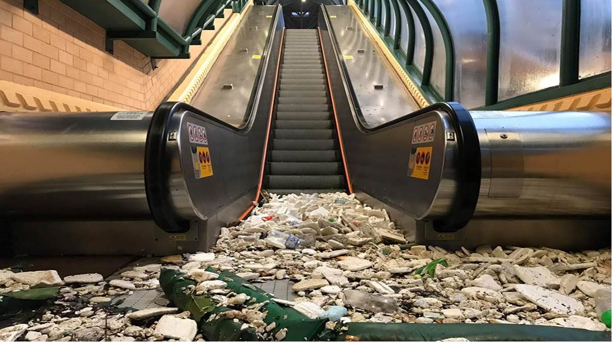 ▲昨日香港杏花邨受到颱風「山竹」肆虐,就連手扶梯都堆滿垃圾。(圖/取自香港突發事故報料區 臉書社團)