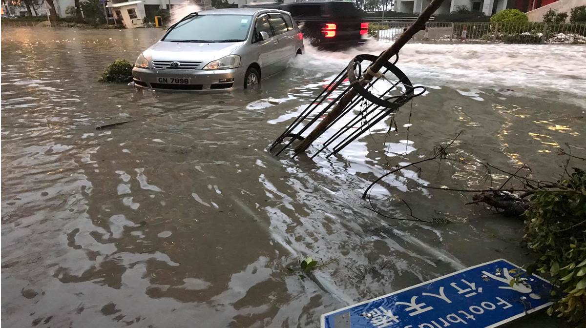 ▲由於颱風所造成的積水未退,還有車輛泡在泥黃的水裡。(圖/取自香港突發事故報料區 臉書社團)