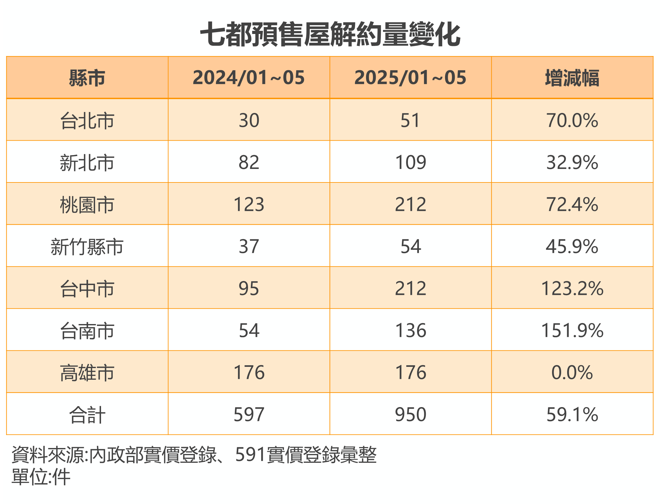 近期房市不確定性再度升溫。回顧今年4月,關稅陰霾引發股市劇烈震盪,衝擊房市買氣,連帶預售解約量也同步增加。根據《591實價登錄》統計,今年前5個月七都預售屋解約量逼近千件,較去年同期增加6成,其中4月解約量更首度突破2百件,且已連續2個月維持在2百件以上,反映預售屋解約壓力不小。