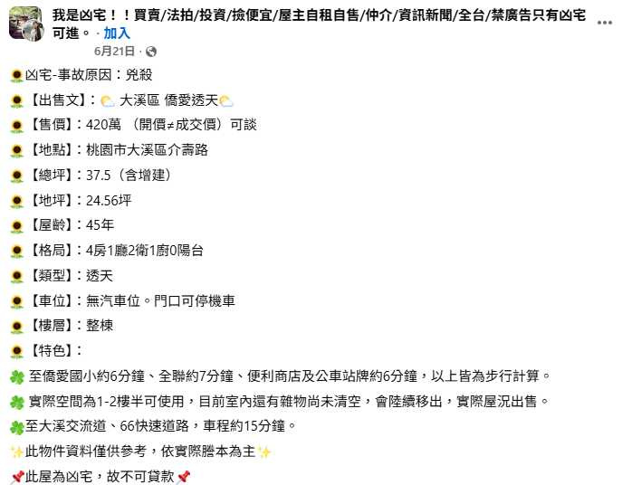 據《三立新聞網》獨家報導,有房仲業者近日在臉書兇宅出售、出租社團發布售屋消息,推薦位於桃園大溪介壽路上的透天厝販售消息,文中明確註明事故原因為「兇殺」,還寫明「此屋為凶宅,故不可貸款」,又提供資訊屋齡45年,總評數含增建37.5坪,實際地坪24.56坪等,屋主則求售420萬元。