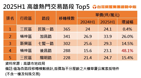 (2025/07/17 11:36)高雄5大熱門交易路段! 台積生活圈就佔2名 「這條路」漲48%最兇