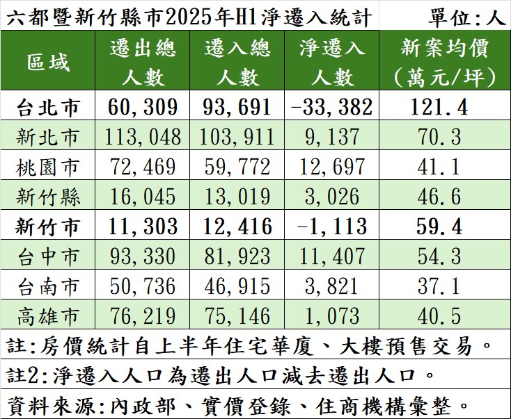 內政部統計顯示,台北市今年上半年共遷出9.3萬人,但僅約6萬人遷入,整體淨遷出人口共達3.3萬名,為全台各縣市中,淨遷出人口最多的縣市。賴志昶指出,細看台北市資料,約3.6萬名北市遷出人口是移往新北市、約7千人移往桃園市,顯示在新北捷運、桃園機場捷運等交通建設串聯下,加上政府日前推出「TPASS政院通勤月票」等政策,加速北市人口遷移速度;另外,北市上半年平均新案房價已達每坪121.4萬元,房價之高有目共睹,剛需族群負擔不起如此高昂價位,僅能往外縣市移動。