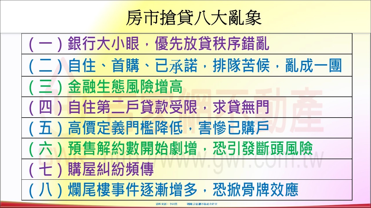 房市自2023年9月新青安啓動後,造成市場搶購、搶貸亂象,加上2024年9月央行第七波限貸令,致使房市搶貸亂象更加嚴重,交易不正常緊縮,換約、解約、糾紛、等亂象叢生。房市趨勢專家李同榮示警,目前房市搶貸八大亂象不除,房市交易恐陷癱瘓,他同時提出四大金融鬆綁解方,建言央行應採更積極措施,化解危機。