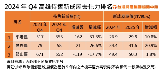 案量大的區域遇到房市反轉,往往形成較大賣壓,不過仍有區域去化速度頗快!台灣房屋集團根據內政部最新資料統計,高雄市2024年第4季待售新成屋新增至約1.39萬宅,年增幅13.6%,顯示買氣趨緩,庫存壓力持續增大!不過,仍有部分區域待售新成屋的去化力表現不俗!剔除偏鄉後,待售新屋量減輕幅度最大的前三名行政區,分別為小港區、鹽埕區及鼓山區。其中,小港區從2023年Q4待售新成屋逾500宅,去化至2024年Q4庫存355宅,年減幅超過3成,為高雄餘屋去化效率最高的區域。