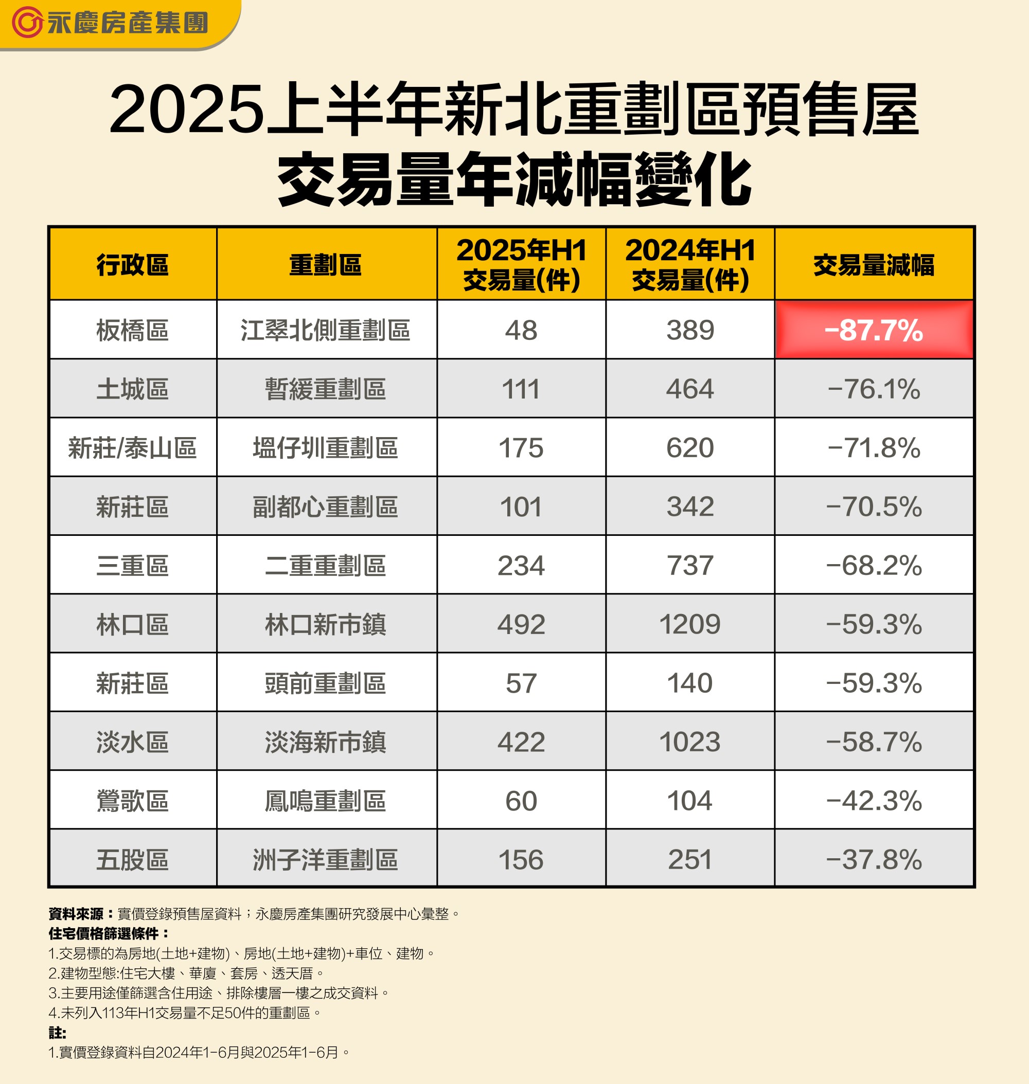 自去年下半年開始,受房貸緊縮及信用管制衝擊,改變民眾對房價持續上漲的預期,預售屋交易量縮明顯,而擁有大量預售屋的重劃區更是首當其衝。永慶房產集團統計2025上半年新北市各個重劃區,對比去年同期,預售屋交易量的變化。板橋江翠北側重劃區今年上半年預售屋交易僅48件,相較去年同期389件,減幅達87.7%,居新北重劃區之首。