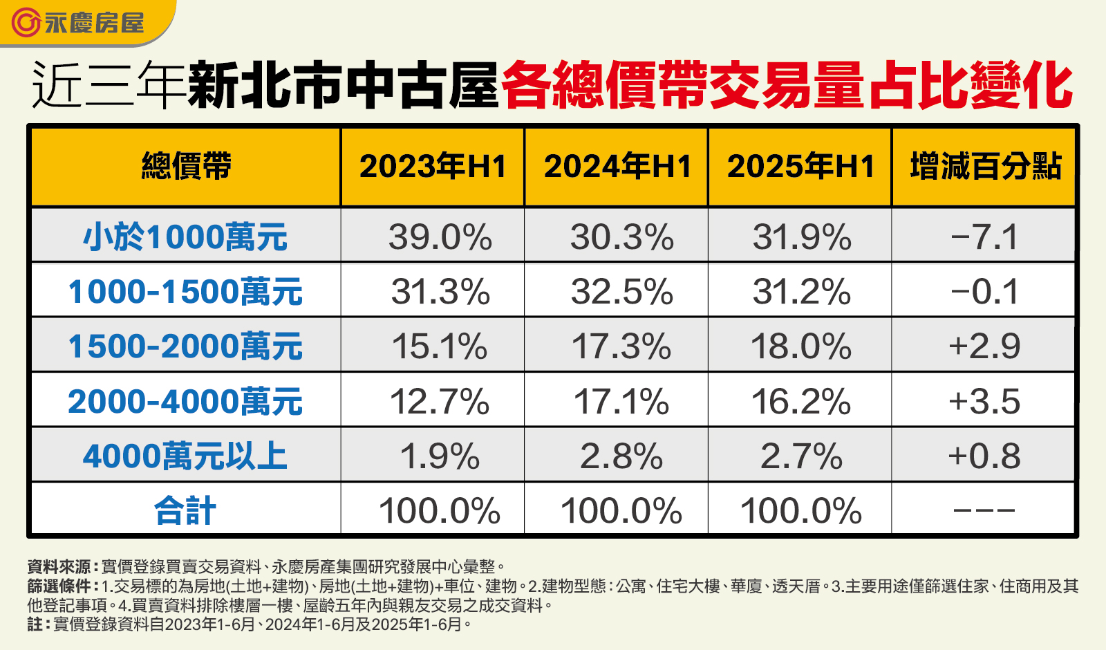 另一方面,換屋族與中、高資產族群有較強的負擔能力,即使受房貸緊縮和信用管制衝擊,仍積極進場,讓中、高總價產品的交易動能獲得支撐,今年上半年,台北總價2000萬元以上的占比都有提升,占比合計為50.7%。