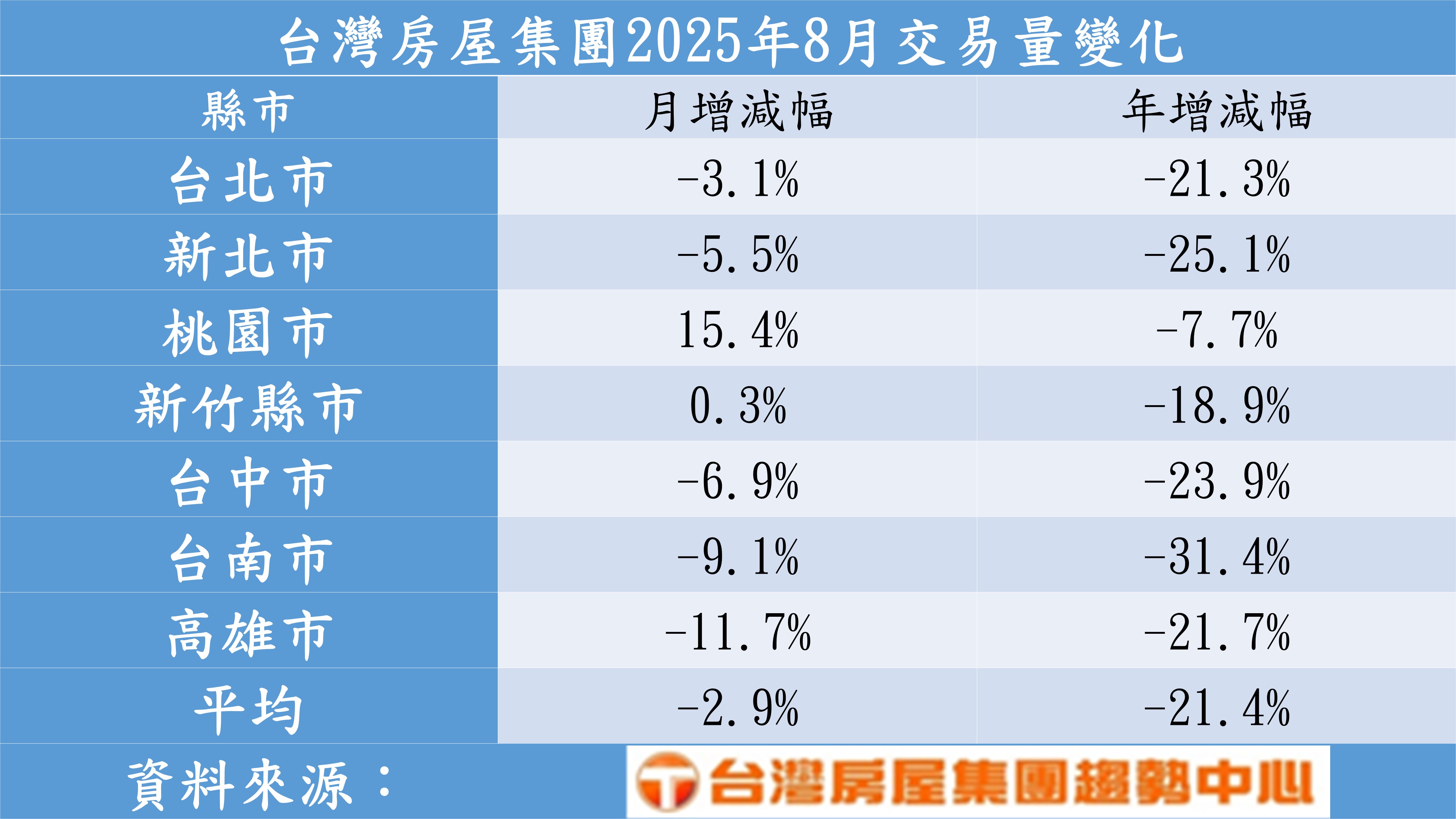 台灣房屋集團統計內部成交行情,觀察2025年八月價量變化,各縣市買氣表現皆較上月疲弱,整體月減2.9%,年減21.4%,其中桃園月增逾15%,年減不到1成,表現均為七大都會區中最佳。