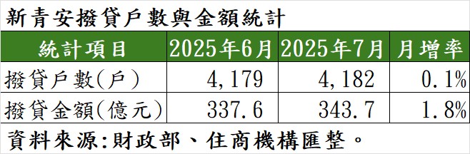 大家房屋企劃研究室公關主任賴志昶則分析,自2023年8月上路以來,新青安已累計核貸近13萬戶、金額逾9,900億元,其中七成以上借款人為40歲以下青壯年族群,過往新青安申貸高峰約落在2024年第二季,當時適逢房市買氣高漲,加諸新青安優惠確實利多頗大,令新青安貸款量體大增,惟之後隨著央行第七波信用管制措施上路,房市趨緩且排撥情況嚴重,新青安申貸量體逐步下滑,直至近期最新數據,7月八大行庫新增新青安撥貸戶數約4,182戶、撥貸金額343.73億元,相較6月成長0.1%、1.8%,顯示漲勢明顯趨緩。