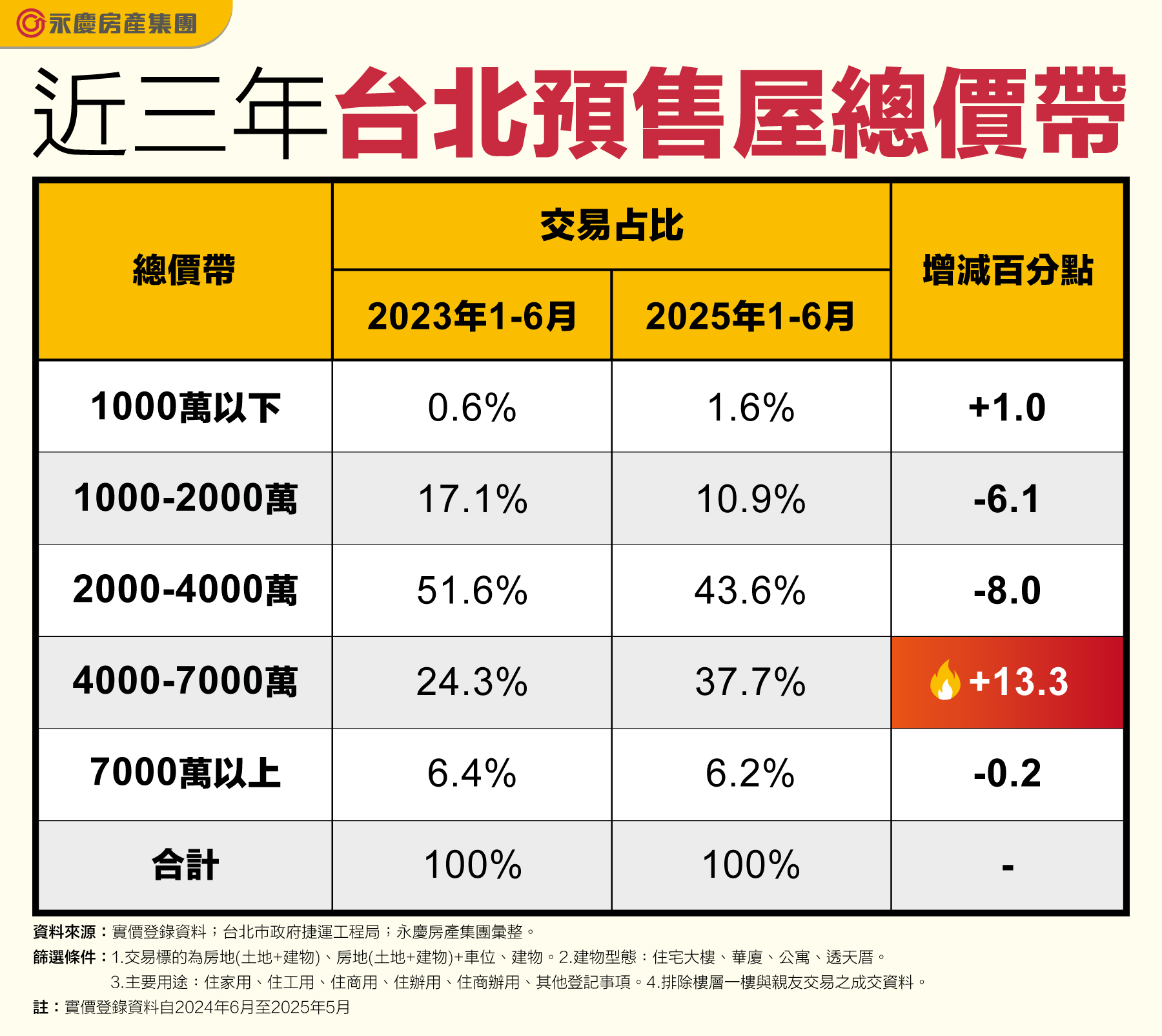 觀察台北市2025年1-6月預售市場交易,與2023年同期相比,總價4000~7000萬元的交易占比增加最多,從24.3%成長至37.7%,增加13.3個百分點,交易占比將近四成;反觀總價1000~4000萬元的交易占比皆呈現萎縮。整體而言,北市預售市場正快速朝中高總價帶集中。