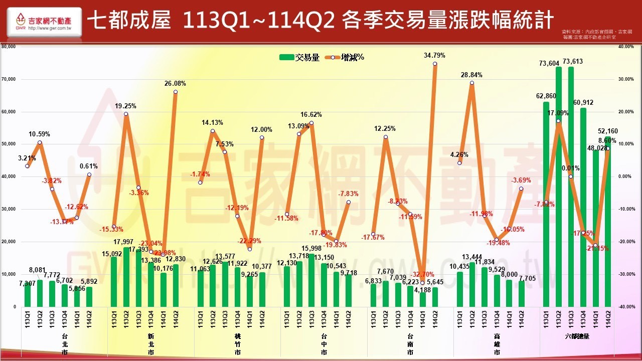 ▼七都成屋2024年Q1~2025年Q2各季「交易量」漲跌幅統計表。(圖/李同榮提供)