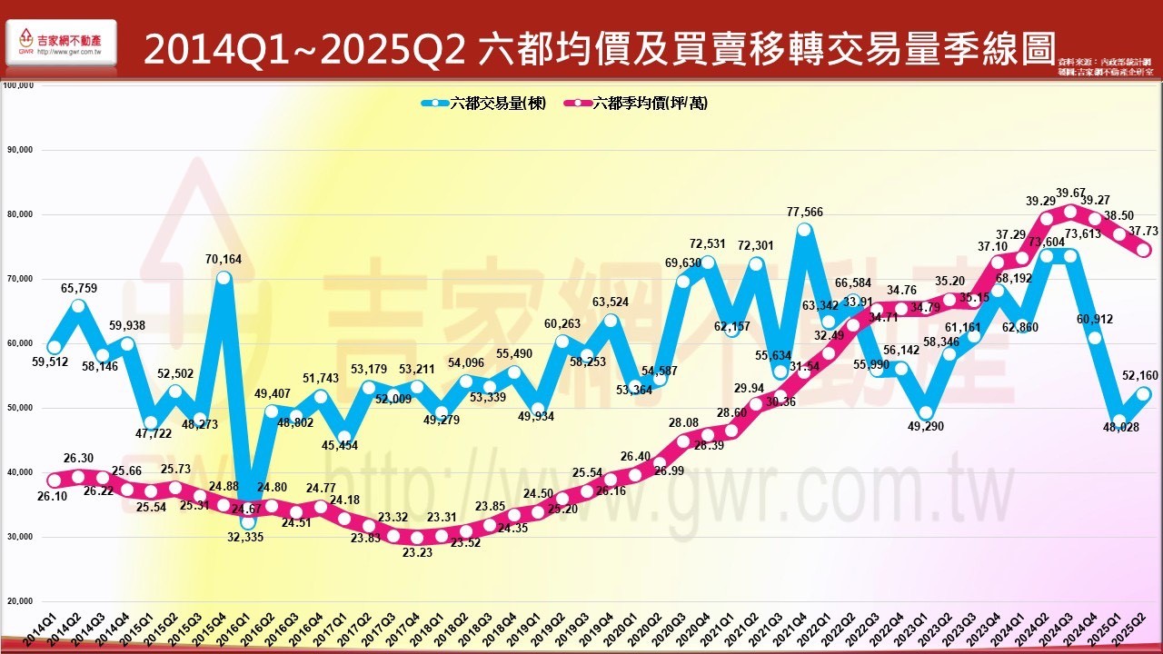 ▼2014年Q1~2025年Q2,六都均價及買賣移轉交易量季線圖。(圖/李同榮提供)