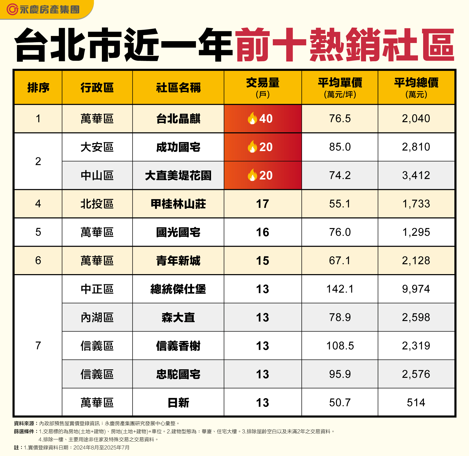 (2025/09/10 13:40)北市10大熱銷社區! 國宅占一半 萬華「這社區」月賣3戶居冠