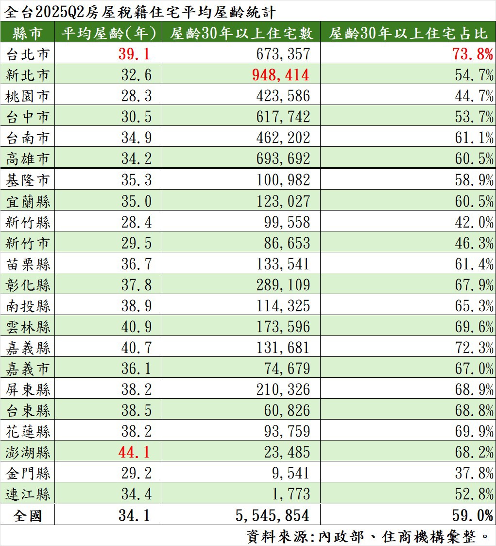 房市翻轉之際,全台卻正面臨「老屋潮」。住商機構觀察內政部數據,全台2025年第二季房屋稅籍住宅平均屋齡達34.1年,為自2009年第一季有統計以來歷史新高;其中平均屋齡最高分別為澎湖、雲林及嘉義縣,平均屋齡均破40年,至於台北市則以39.1年排名全台第四。大家房屋企劃研究室公關主任賴志昶分析,全台隨著改建速度不及屋齡增長趨勢,此波老屋潮將是未來房市最不容忽視的挑戰。
