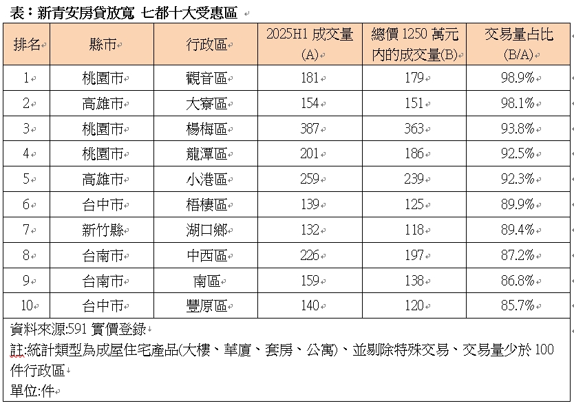 根據財政部最新統計顯示,8月新青安房貸撥貸金額降至近一年半新低;不過,隨著本月初政府宣布新青安房貸將不再受不動產放款集中度限制,市場預期可望為房市注入新動能。由於新青安最高貸款額度僅1,000萬元,若以貸款八成回推,最受惠的仍鎖定總價1,250萬元以內的成屋。根據《591實價登錄》統計,今年上半年七都各行政區總價符合條件的交易量占比,前十大區域中有超過八成五的交易量總價皆不超過1,250萬元,反映鬆綁新青安房貸後,這些區域將成為最大贏家。