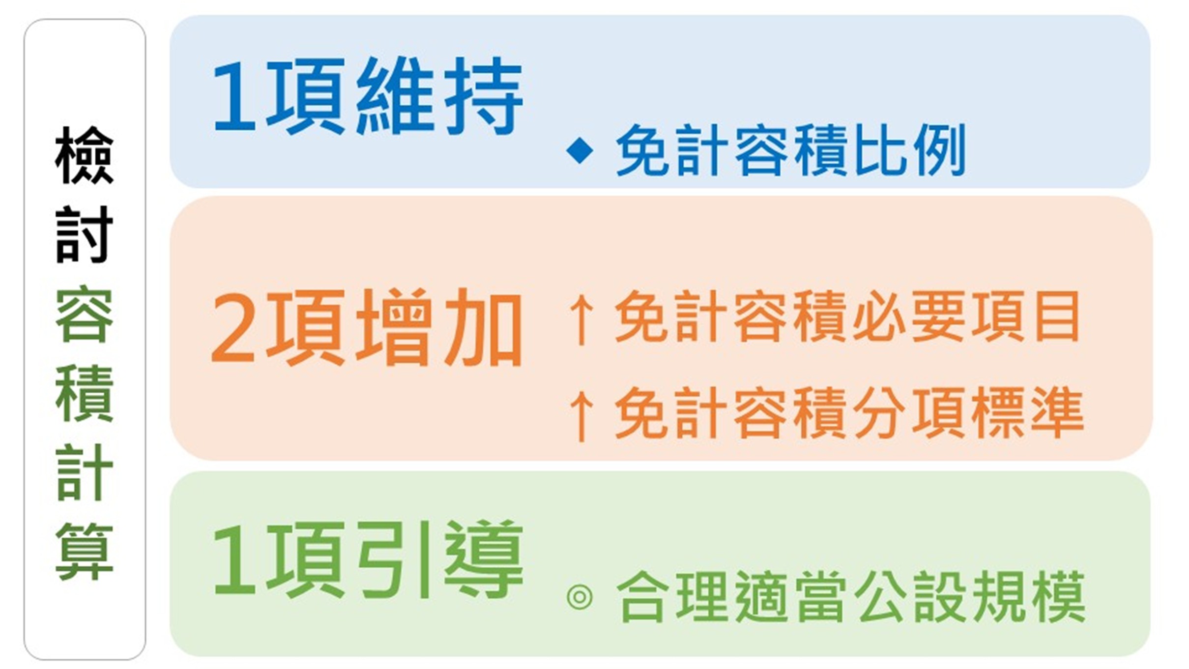 內政部表示,虛坪改革包括「檢討容積計算」、「停車空間分配」及因應高齡化社會的「一般電梯增列為免計容積項目」等3大重點,並增訂管委會設置面積的合理標準及上下限,以引導公設合理規劃及設計,滿足社區運作的基本需求同時,也避免不實用的公設出現。