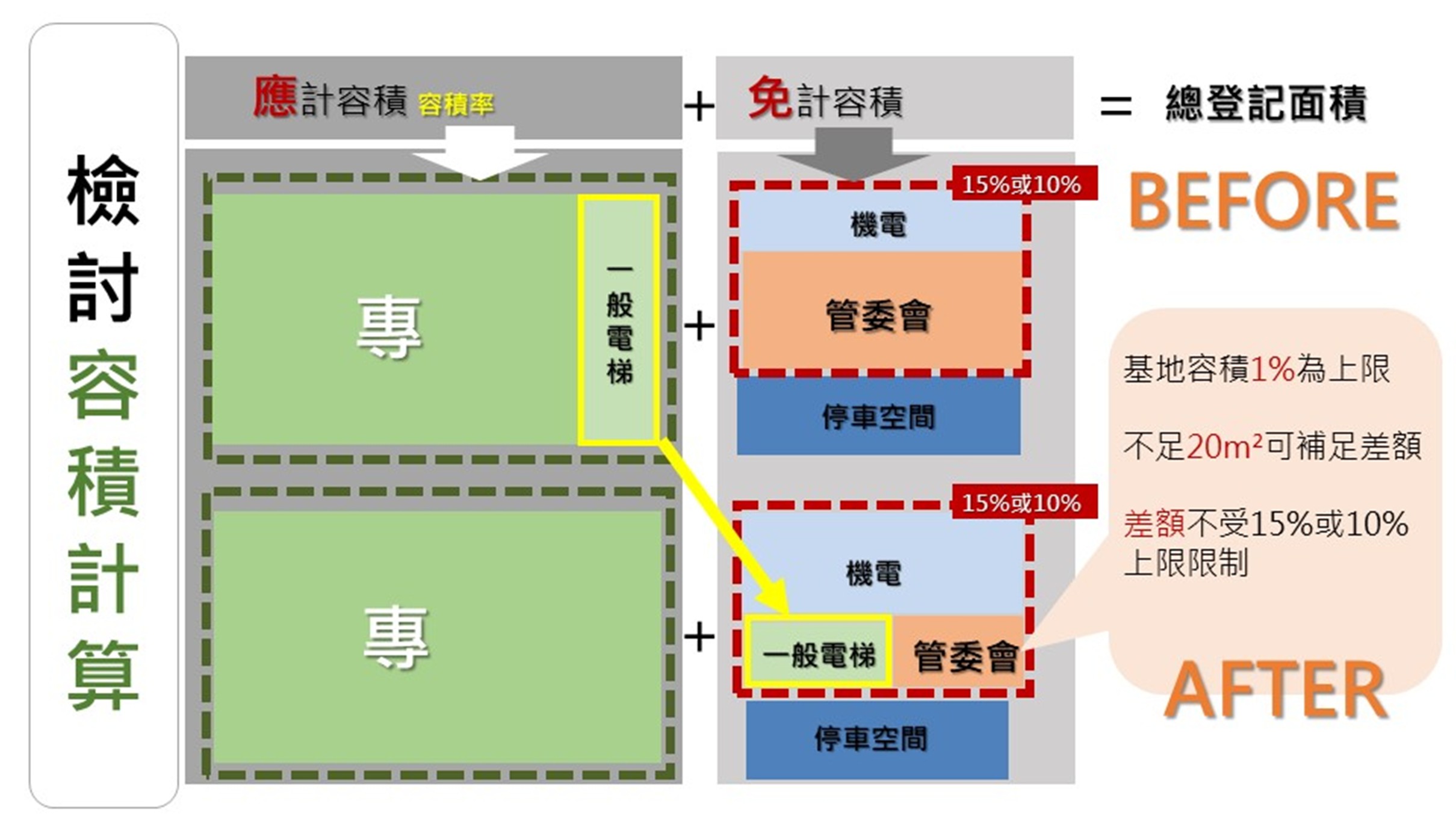內政部推動虛坪改革修法,增列電梯為免計容積項目、限制管委會使用空間,也要將停車位及車道空間調整為專有,沒買車位者不用負擔車道面積,評估公設比至少可下降5%,建商可能回歸總價計價。