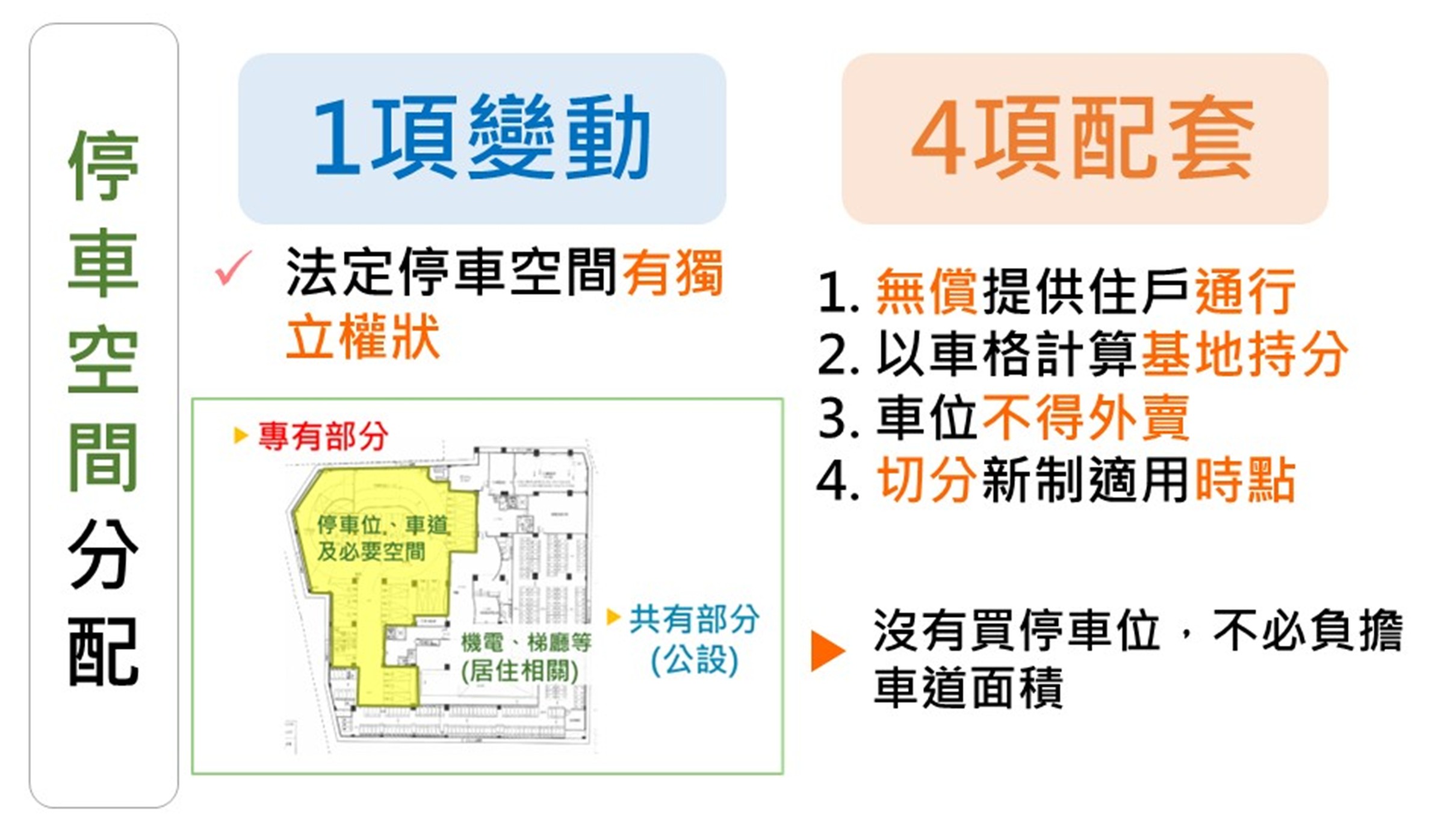 內政部說明,依現行公寓大廈管理條例規定,法定停車空間附屬於防空避難空間,屬共有的公共設施;但現行實務上停車空間為個人專屬使用,具獨立性且為交易標的,虛坪改革重點之一要將停車位及車道使用空間調整為專有部分,可核發權狀、明確歸屬,貼近實際需求,且可與機電、梯廳等居住公設明顯區別,讓購屋負擔項目更透明,也不會影響居住維生、逃生及安全,並為保障住戶權益提出相關配套措施,如:法定停車位優先滿足社區基本停車需求,對於已興建中建案及都市更新計畫報核個案,也將有過渡條款、緩衝宣導期及正式施行日期,降低制度改變所造成的影響。